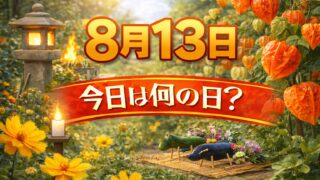 8月8月13日は何の日?記念日・出来事・誕生日の有名人まとめ 2026年 8月13日 (木) 先勝 (六曜とは?) 2027年 8月13日 (金) 友引 (六曜とは?) 8月13日は、お盆の入りとして広く知られ、先祖や故人を迎える準備が始まる日です。日本ならではの習慣や家庭行事が多く、静かに気持ちを整...8月