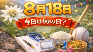 8月8月18日は何の日?記念日・出来事・誕生日の有名人まとめ 2026年 8月18日 (火) 赤口 (六曜とは?) 2027年 8月18日 (水) 大安 (六曜とは?) 8月18日は、夏のピークが少し落ち着き、生活リズムを整え直したくなるタイミングです。学びや運動を“再開”しやすい日でもあり、季節の切...8月