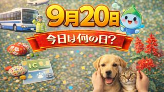 9月9月20日は何の日?記念日・出来事・誕生日の有名人まとめ 2026年 9月20日 (日) 大安 (六曜とは?) 2027年 9月20日 (月) 先負 (六曜とは?) 9月20日は、秋の空や乗り物、いのちにまつわる取り組みが集まりやすい日です。日本では「空の日」や「バスの日」などが知られ、また動物愛...9月